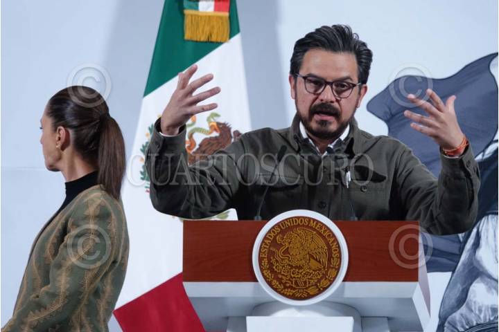CIUDAD DE MÉXICO, 15ABRIL2025.- Zoé Robledo, director general del Instituto Mexicano del Seguro Social (IMSS), acompañado de Claudia Sheinbaum, presidenta constitucional de los Estados Unidos Mexicanos, durante su participación en la mañanera de pueblo realizada en Palacio Nacional. FOTO: GRACIELA LÓPEZ/CUARTOSCURO.COM