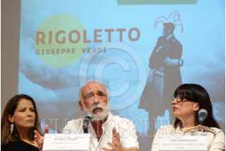 CIUDAD DE MÉXICO, 15ABRIL2025.- Enrique Singer, director en escena, durante su participación en la conferencia de prensa de la Ópera Rigoletto, de Giuseppe Verdi, realizada en la Sala Adamo Boari del Palacio de Bellas Artes. En la imagen lo acompañan la actriz Leticia de Altamirano, y la subdirectora artística CNO, Lilia Maldonado. FOTO: GRACIELA LÓPEZ/CUARTOSCURO.COM