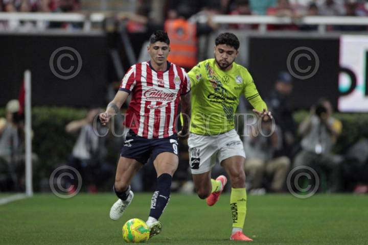 ZAPOPAN, JALISCO, 15ABRIL2025.- Alan Pulido jugador de Chivas disputa el balón con el contrario de Puebla, José Pachuca, esto en partido correspondiente jornada 16 del Torneo Clausura 2025 de la Liga MX, en donde se enfrentan los equipos de Chivas vs Puebla y en juego que se lleva a cabo en el Estadio Akron, el marcador al final es 1-0, a favor del equipo de casa. FOTO: FERNANDO CARRANZA GARCIA / CUARTOSCURO.COM