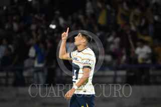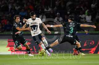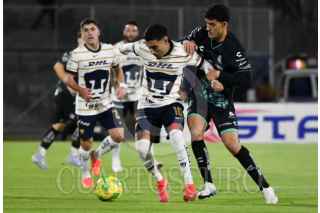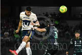 CIUDAD DE MÉXICO, 16ABRIL2025.- Los Pumas de la UNAM vencieron dos goles a cero al Club Santos, en partido correspondiente a la jornada 16 del torneo clausura 2025 de la Liga MX. En la imagen, Leonardo Suárez, mediocampista de Pumas, frente a Salvador Mariscal, mediocampista de Santos. FOTO: MARIO JASSO/CUARTOSCURO.COM