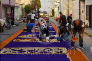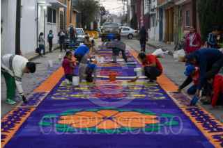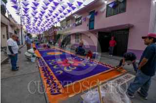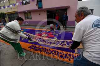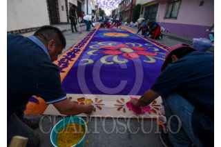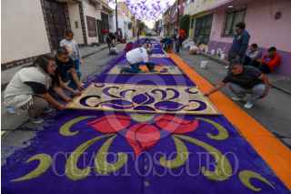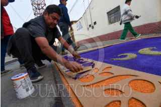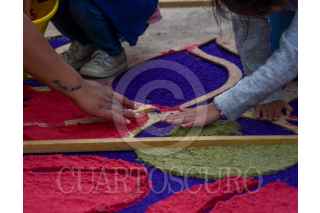 TOLUCA, ESTADO DE MÉXICO, 17ABRIL2025.- La delegación toluqueña de Capultitlán durante 40 días sus calles se visten de color por los tapetes de aserrín que son elaborados por el grupo de tepeteros, quienes tienen ya 15 años que retoman esta tradición de más de 100 años, estos tapetes los elaboran desde el miércoles de ceniza hasta el sábado de resurrección y son para recibir la imagen de Jesús que visita distintos hogares; llegan a medir hasta 40 metros y ocupan alrededor de 100 kilos de aserrín al que le dan color, en su elaboración participan adultos y niños que buscan continuar con esta tradición. FOTO: CRISANTA ESPINOSA AGUILAR /CUARTOSCURO.COM