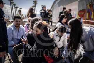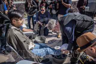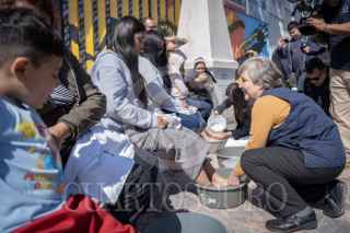 IJUANA, BAJA CALIFORNIA 17ABRIL2025.- Con motivo de las celebraciones religiosas de semana santa, este jueves santo, el padre Patrick Murphy, director de la Casa Migrante de Tijuana, realizó la ceremonia de lavado de pies a 12 personas migrantes entre adultos y niños, la mayoría mexicanos, en el muro fronterizo de Playas de Tijuana. El director de la Casa Migrante señaló que escogieron el muro fronterizo de Playas de Tijuana para recordarle a la gente que aquí están los migrantes que necesitan apoyó. Mencionó que los migrantes se sienten tristes porque ahora no hay manera de cruzar legalmente y no tienen posibilidades de hacer algo al respecto, por lo que poco a poco están saliendo a rentar para establecerse en Tijuana. Señaló que actualmente hay 37 personas en la Casa Migrante, anteriormente siempre tenían por lo menos a 50 personas, lo que representa una gran reducción en el número de migrantes que llegan a la ciudad. Crítico como un "show" el reforzamiento y militarización del muro fronterizo por parte del presidente de Estados Unidos, Donald Trump. Además, hizo un exhorto a las autoridades locales para mejorar sus acciones y tomar mejores decisiones en favor a los migrantes. FOTO: OMAR MARTÍNEZ / CUARTOSCURO.COM