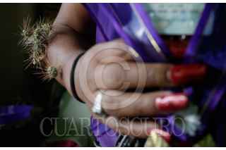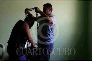 ATLIXCO, PUEBLA, 18ABRIL2025.- Ocho mujeres engrilladas participaron con profunda devoción en la procesión de Viernes Santo en la colonia Álvaro Obregón, en Atlixco. Los engrillados son penitentes que recorren el viacrucis cargando pesadas cadenas y portando espinas como símbolo de sacrificio y fe. FOTO: MIREYA NOVO/CUARTOSCURO.COM