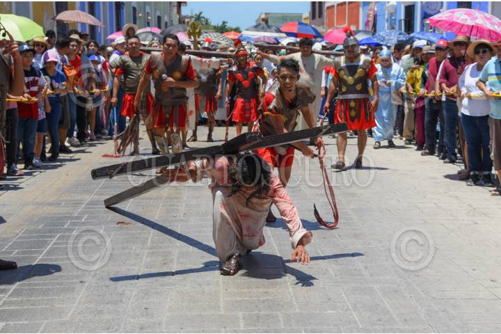 CAMPECHE, CAMPECHE, 18ABRIL2025.- Feligreses del barrio de Santa Ana reviven con fervor la pasión de Cristo en el tradicional viacrucis viviente, que cumple 63 años de historia en Campeche. FOTO: MICHAEL BALAM/CUARTOSCURO.COM