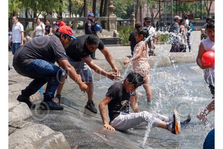 CIUDAD DE MÉXICO, 19ABRILO2025.- Dos jóvenes arrojan a otro a la fuente de la Alameda Central. La Secretaría de Gestión Integral de Riesgos y de Protección Civil (SGIRPC) activó la alerta amarilla por altas temperaturas en 10 alcaldías, donde se esperan entre 30 y 32°C. FOTO: MAGDALENA MONTIEL/CUARTOSCURO.COM