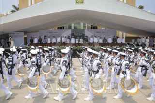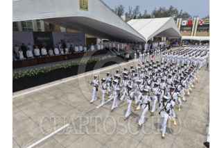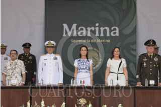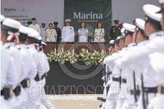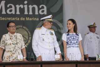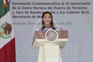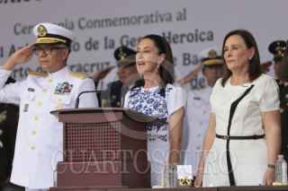 ÁLVARADO, VERACRUZ, 21ABRIL2025.- Rosa Icela Rodríguez, secretaria de Gobernación; Raymundo Pedro Morales, secretario de Marina; Claudia Sheinbaum, Presidenta de México; Rocío Nahle, gobernadora de Veracruz, y Ricardo Trevilla Trejo, secretario de la Defensa Nacional, encabezaron la conmemoración del 111 Aniversario de la Defensa del Puerto de Veracruz contra la invasión estadounidense en la Base Naval de Antón Lizardo. FOTO: PRESIDENCIA/CUARTOSCURO.COM
