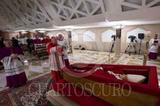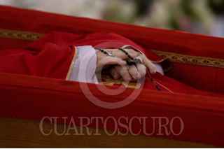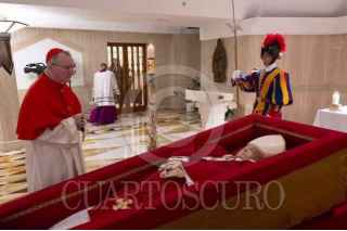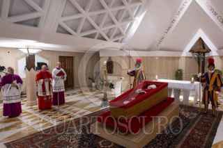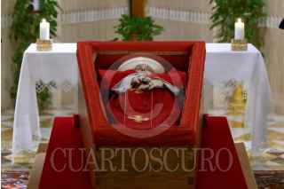 CIUDAD DEL VATICANO, ITALIA, 22ABRIL2025.- El Vaticano difundió las primeras imágenes en las que se aprecia al Papa Francisco en su féretro de madera al interior de la capilla de la Casa Santa Marta. FOTO: DICASTERIO PARA LA COMUNICACIÓN DE LA SANTA SEDE/CUARTOSCURO.COM