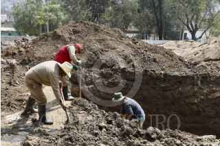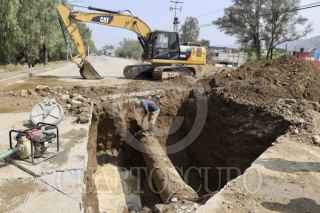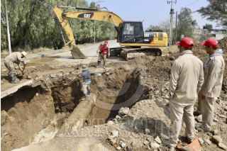 OAXACA DE JUÁREZ, OAXACA, 22ABRIL2025.- Debido a la lluvia registrada el pasado 20 de abril y una obra inconclusa de drenaje, se registró un socavón en las Riveras del Río Atoyac, una de las principales vías de acceso a la Central de Abasto de la capital de Oaxaca. Personal del Sistema Operador de los Servicios de Agua Potable y Alcantarillado de Oaxaca (Soapa) trabajan para reparar la red hidráulica que resultó afectada por el hundimiento de tierra, además se ha informado que dicha afectación provocará retrasos en el suministro de agua potable en las zonas sur, oriente y noreste de la zona metropolitana de Oaxaca. La vía fue cerrada a la circulación mientras concluyen los trabajos de reparación. FOTO: CAROLINA JIMÉNEZ/CUARTOSCURO.COM