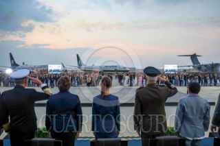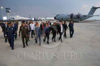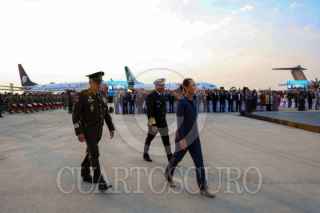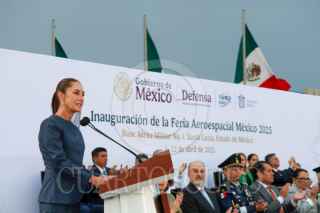 ZUMPANGO, ESTADO DE MÉXICO, 22ABRILO2025.- Ricardo Trevilla, secretario de la Defensa Nacional, y Claudia Sheinbaum, presidenta de México, encabezó la inauguración de la Feria Aeroespacial Mexicana (FAMEX) 2025 en las inmediaciones de la Base Aérea de Santa Lucía. FOTO: PRESIDENCIA/CUARTOSCURO.COM
