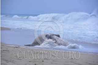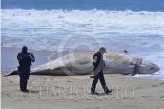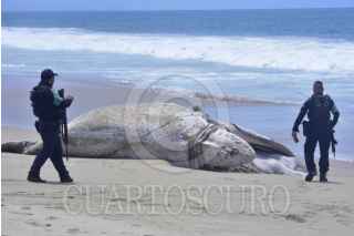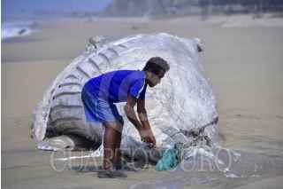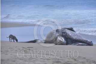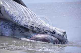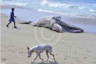 ACAPULCO, GUERRERO, 23ABRIL2025.- Una ballena jorobada que aprecio ayer muerta en la playa de La Barra de Coyuca, continúan en el lugar, un prestador de servicios turísticos del lugar mostró las cuerdas de un red de trasmallo con las que ballena se enredó y causó su probable muerte, vecinos piden que las autoridades retiren los restos del cetáceo que ya empezó a despedir malos olores por su estado de descomposición. FOTO: CARLOS ALBERTO CARBAJAL/CUARTOSCURO.COM