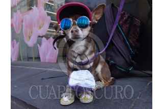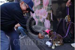 CIUDAD DE MÉXICO, 23ABRIL2025.- Con el nombre de Ana, una perrita salchicha pide apoyo para sus croquetas en la calle de Madero en el Centro Histórico. En la imagen, un señor se acerca a darle algunas monedas. FOTO: GRACIELA LÓPEZ/CUARTOSCURO.COM