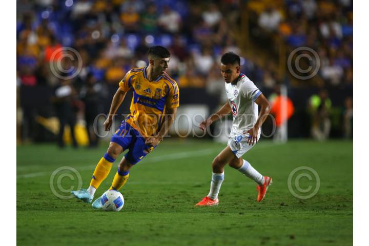 SAN NICOLÁS DE LOS GARZA, NUEVO LEÓN, 23ABRIL2025.- Juan Brunetta de Tigres, se disputa el balón con Ángel Sepúlveda de Cruz Azul, en el estadio Universitario, en el partido correspondiente a la Ida en Semifinales de la Concacaf Champions Cup. Marcador final: Tigres: 1 - Cruz Azul: 1. FOTO: GABRIELA PÉREZ MONTIEL / CUARTOSCURO.COM
