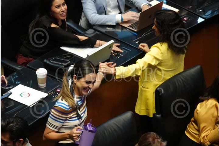 CIUDAD DE MÉXICO, 24ABRIL2025.- Las senadoras Andrea Chávez y Susana Harp se saludaron durante la Sesión Ordinaria en el Senado de la República. FOTO: GRACIELA LÓPEZ/CUARTOSCURO.COM