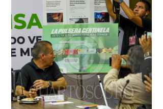 TOLUCA, ESTADO DE MÉXICO, 28ABRIL2025.- José Alberto Couttolenc Buentello, líder de la fracción parlamentaria del Partido Verde Ecologista en conferencia de prensa propuso el uso de la pulsera “Centinela” como un método para detectar bebidas adulteradas y así garantizar la integridad de las personas que acuden a centros nocturnos, bares y establecimientos en donde se venden bebidas alcohólicas, esta pulsera ayuda a detectar más de 20 tipos de sustancias; también anunció será presentada la iniciativa para castigar hasta con 7 años de prisión a quien adulteré una bebida de otra persona. FOTO: CRISANTA ESPINOSA AGUILAR /CUARTOSCURO.COM