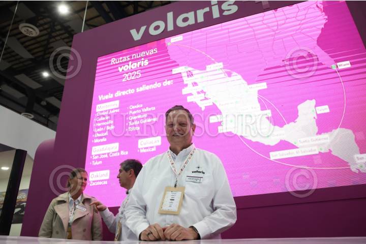 TIJUANA, BAJA CALIFORNIA, 29ABRIL2025.- Enrique Beltranena, CEO de Volaris, posa en el stand de la aerolínea durante el Tianguis Turístico 2025, en el Baja California Center. FOTO: MOISÉS PABLO/CUARTOSCURO.COM