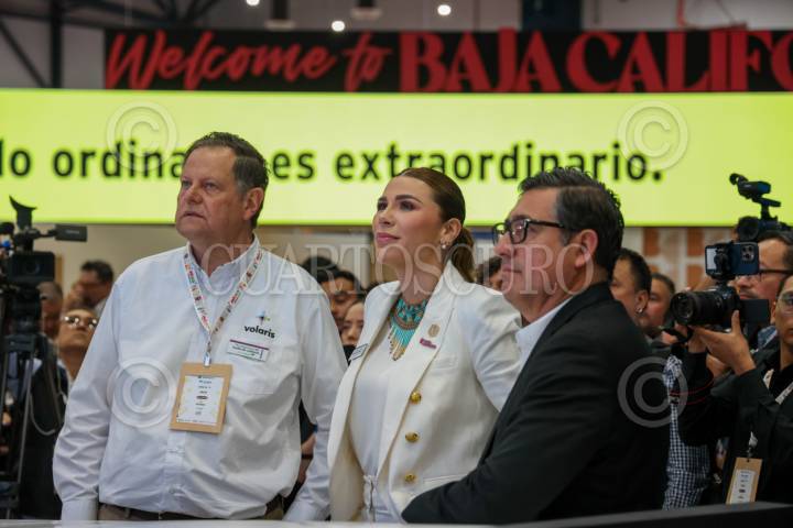 TIJUANA, BAJA CALIFORNIA, 29ABRIL2025.- Marina del Pilar Ávila, gobernadora de Baja California, y Enrique Beltranena, CEO de Volaris, anunciaron nuevas rutas de esta aerolínea en el estado, durante el Tianguis Turístico 2025. FOTO: MOISÉS PABLO/CUARTOSCURO.COM