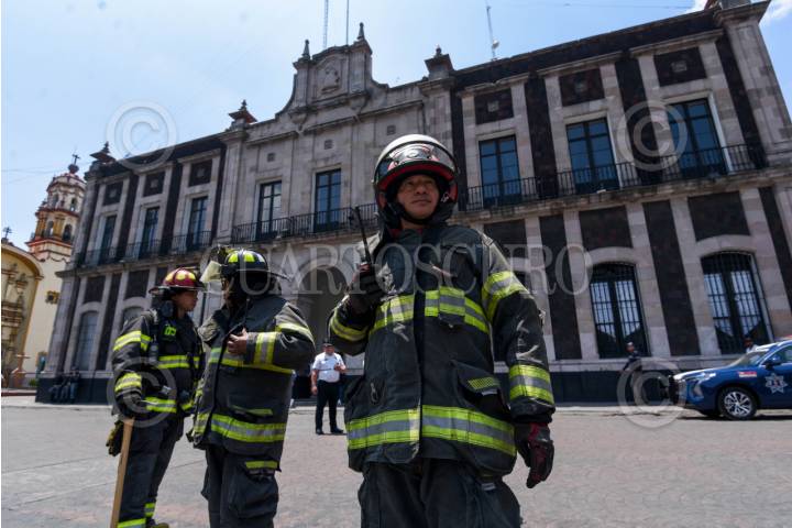 TOLUCA, ESTADO DE MÉXICO, 29ABRIL2025.- En la capital mexiquense se participó en el Primer Simulacro Nacional 2025, con hipótesis de un sismo de magnitud 8.1 con epicentro en Tehuantepec, Oaxaca, lo principales edificios como Palacio de Gobierno, Cámara de Diputados, Poder Judicial del Estado de México y el Ayuntamiento de Toluca, elementos de PC, bomberos y brigadas de PC realizaron el desalojo de edificios así como la revisión de las instalaciones. FOTO: CRISANTA ESPINOSA AGUILAR /CUARTOSCURO.COM