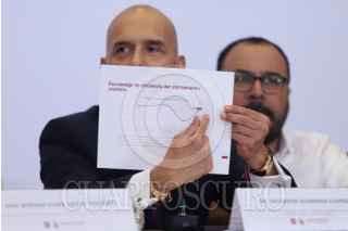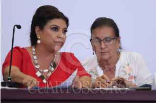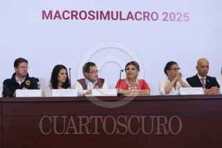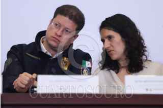 CIUDAD DE MÉXICO, 29ABRIL2025.- Pablo Vázquez, secretario de Seguridad Ciudadana y la fiscal general de la capital, Bertha Alcalde, dialogan durante la conferencia. FOTO: DANIEL AUGUSTO/ CUARTOSCURO.COM