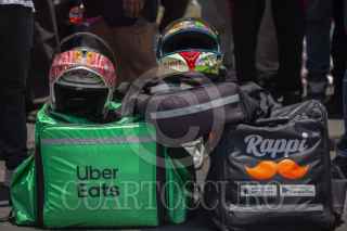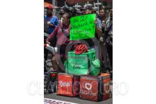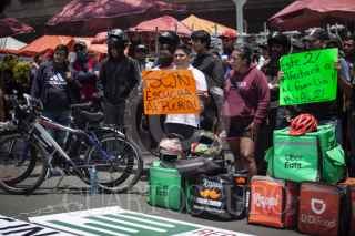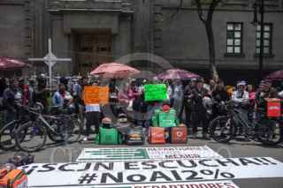 CIUDAD DE MÉXICO, 30ABRIL2025.- Trabajadores repartidores vía aplicación protestas a fuera de la Suprema Corte de Justicia de la Nación (SCJN) por la votación del impuesto de 2% por “uso de la calle”. FOTO: ANDREA MURCIA /CUARTOSCURO.COM