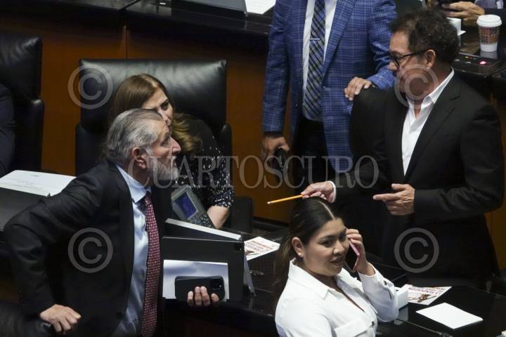 CIUDAD DE MÉXICO, 30ABRIL2025.- Adán Augusto López, coordinador de la bancada de Morena en el Senado y presidente de la Jucopo, y el vicecoordinador Ignacio Mier durante la sesión ordinaria en la que se aprobó la Estrategia Nacional de Seguridad Pública 2024-2030. FOTO: GALO CAÑAS/CUARTOSCURO.COM