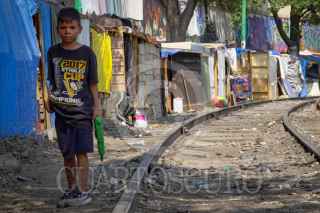 CIUDAD DE MÉXICO 30ABRIL2025.- En el marco del Día del niño y de la niña, un niño migrantes observa directamente a la cámara mientras sostiene una pistola de juguete entre hogares imporvisados con madera, cartón y lonas en la Colonia Vallejo. FOTO: ROGELIO MORALES CUARTOSCURO.COM