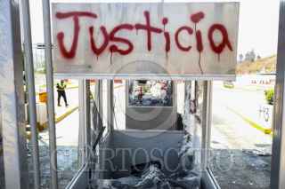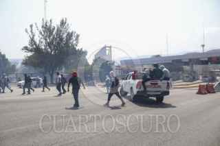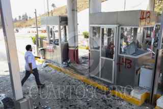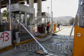 CHILPANCINGO, GUERRERO, 30ABRL2025.- Estudiantes de la Escuela Normal Rural 'Raúl Isidro Burgos' de Ayotzinapa arremetieron con piedras y palos contra los módulos de cobro de la caseta de peaje de Palo Blanco, en la Autopista del Sol. La acción se desarrolló durante la jornada de manifestaciones que derivan del homicidio perpetrado en contra de Marco Antonio Suástegui Muñoz, vocero del Consejo de Ejidos y Comunidades Opositoras a la Parota (CECOP). FOTO: DASSAEV TÉLLEZ ADAME/CUARTOSCURO.COM