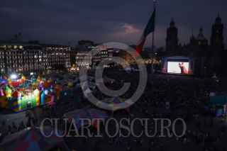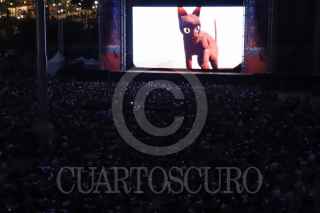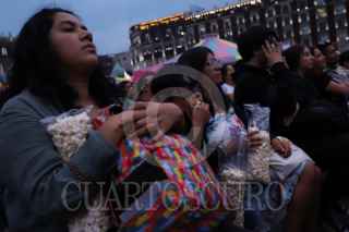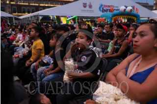 CIUDAD DE MÉXICO, 30ABRIL2025.- Infantes comen palomitas mientras ven la película Flow en el Zócalo. FOTO: DANIEL AUGUSTO/ CUARTOSCURO.COM