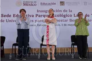 TEXCOCO, ESTADO DE MÉXICO, 03MAYO2025.- Claudia Sheinbaum, presidenta de México, encabezó la inauguración de la Universidad para el Bienestar sede Parque Ecológico Lago de Texcoco. La acompañan: Delfina Gómez, gobernadora del Estado de México, y Rosa Icela Rodríguez, secretaria de Gobernación. FOTO: PRESIDENCIA/CUARTOSCURO.COM