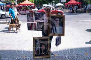 CIUDAD DE MÉXICO, 04MAYO2025.- Una vendedora ofrece fotografías afuera del World Trade Center de Claudia Sheinbaum, presidenta de México y de su antecesor Andrés Manuel López Obrador. FOTO: GRACIELA LÓPEZ/CUARTOSCURO.COM