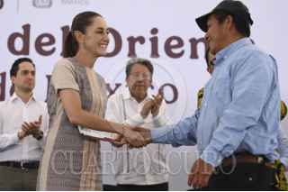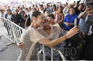 TLALNEPANTLA, ESTADO DE MÉXICO, 04MAYO2025.-Claudia Sheinbaum, presidenta de México, presentó el Plan integral para el oriente del Estado de México, enfocado en atender el rezago en salud, educación, vivienda y seguridad en 10 municipios: Tlalnepantla, Nezahualcóyotl, Chalco, Chicoloapan, Chimalhuacán, Ecatepec, Ixtapaluca, La Paz, Texcoco y Valle de Chalco-Solidaridad. En la imagen, la mandataria entregó una tarjeta de Bienestar a un vecino del municipio de Tlalnepantla. FOTO: PRESIDENCIA /CUARTOSCURO.COM