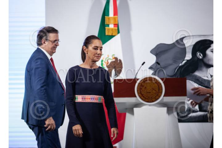 CIUDAD DE MÉXICO, 05MAYO2025.- Claudia Sheinbaum Pardo, presidenta de México acompañada de Marcelo Ebrard Casaubón, secretario de Economía durante conferencia matutina en en Palacio Nacional. FOTO: ANDREA MURCIA /CUARTOSCURO.COM