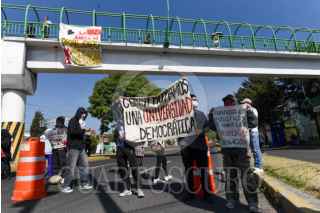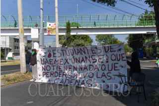 TOLUCA, ESTADO DE MÉXICO, 06MAYO2025.- Estudiantes de la Facultad de Humanidades y Artes de la UAEMÉX que se encuentran en paro, bloquearon en ambos sentidos Paseo Tollocan a la altura de Ciudad Universitaria, exigen no se criminalice el movimiento estudiantil, cancelen las clases en línea, entre otras cosas; la cabeza de Adolfo López Mateos que se encuentra en el cerro de CU amaneció con una bandera rojinegra. FOTO: CRISANTA ESPINOSA AGUILAR /CUARTOSCURO.COM