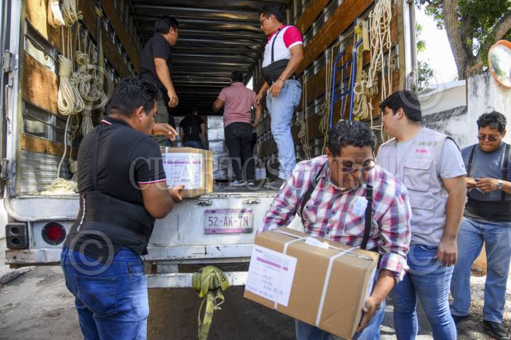 CAMPECHE, CAMPECHE, 06MAYO2025.- Elementos de la Marina, Guardia Nacional y SEDENA custodian el arribo de las boletas electorales al INE en Campeche, rumbo a las elecciones de magistrados del 1 de junio. En la entidad se recibieron 4 millones 229 mil 108 de boletas electorales. FOTO: MICHAEL BALAM/CUARTOSCURO.COM