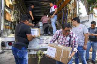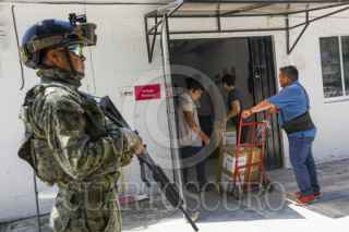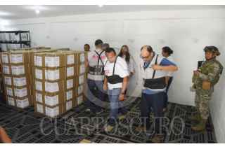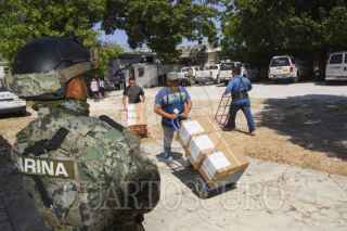 CAMPECHE, CAMPECHE, 06MAYO2025.- Elementos de la Marina, Guardia Nacional y SEDENA custodian el arribo de las boletas electorales al INE en Campeche, rumbo a las elecciones de magistrados del 1 de junio. En la entidad se recibieron 4 millones 229 mil 108 de boletas electorales. FOTO: MICHAEL BALAM/CUARTOSCURO.COM