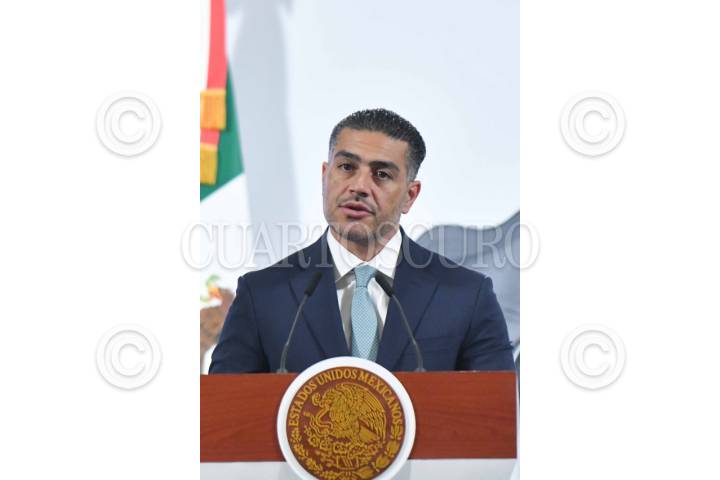 CIUDAD DE MÉXICO, 08MAYO2025.- Omar García Harfuch, secretario de Seguridad y Protección Ciudadana, durante su intervención en la conferencia matutina realizada en Palacio Nacional. FOTO: MARIO JASSO/CUARTOSCURO.COM