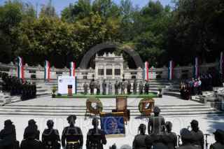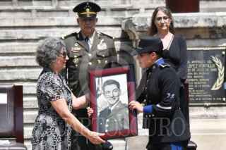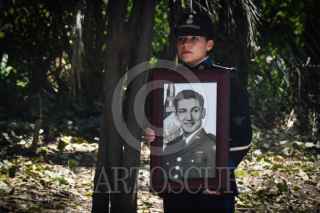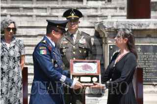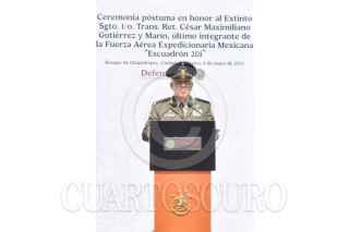 CIUDAD DE MÉXICO, 08MAYO2025.- Ricardo Trevilla, secretario de la Defensa Nacional y Óscar René Rubio, comandante de la Fuerza Aérea Mexicana, encabezaron la ceremonia póstuma en Honor al Sargento 1/o. de Transmisiones Retirado César Maximiliano Gutiérrez Marín, último integrante del "Escuadrón 201" unidad aérea mexicana que participó en la segunda guerra mundial. La ceremonia fue realizada en el monumento a la Fuerza Aérea Expedicionaria Mexicana ubicado en el Bosque de Chapultepec. FOTO: MARIO JASSO/CUARTOSCURO.COM