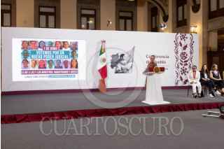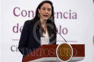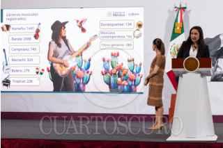 CIUDAD DE MÉXICO, 09MAYO2025.- Claudia Curiel , secretaria de Cultura, durante la conferencia "Mañanera del Pueblo" desde Palacio Nacional en dónde se presentó la recepción de concursantes para el certamen México Canta. FOTO: PRESIDENCIA/CUARTOSCURO.COM