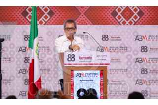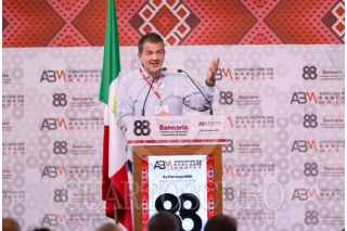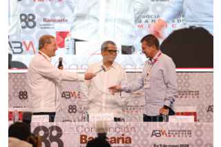 NUEVO NAYARIT, NAYARIT, 09MAYO2025.- Julio Carranza, presidente saliente de la ABM; Édgar Amador Zamora, secretario de Hacienda y Crédito Público, Emilio Romano Mussali, nuevo presidente de la ABM, durante la ceremonia de clausura de la 88 Convención Bancaria "La Banca y su aportación al desarrollo de México". FOTO: CUARTOSCURO.COM