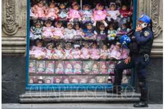 CIUDAD DE MÉXICO, 10MAYO2025.- Una mujer policía realiza una llamada mientras se recarga al exterior de un mostrados de una tienda departamental que exhibe muñecas. FOTO: MARIO JASSO/CUARTOSCURO.COM