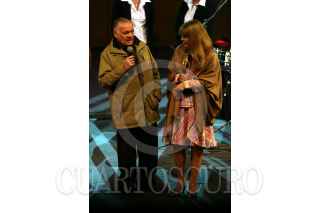 VILLAHERMOSA, TABASCO, 29OCTUBRE2007.- El afamado escultor José Luís Cuevas recibió en manos del gobernador tabasqueño Andrés Granier Melo la presea Sabia del Edén en la clausura del 5 Festival Cultural Ceiba, el caul tuvo lugar en el teatro estatal Esperanza Iris a donde llego acompañado de su esposa. FOTO: MARCO POLO GUZMÁN HERNÁNDEZ.