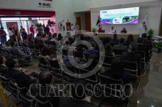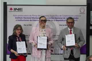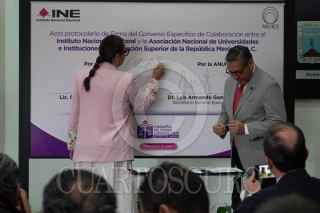 CIUDAD DE MÉXICO 16MAYO2025.- Luis González, secretario general ejecutivo ANUIES, Claudia Espino, secretaria ejecutiva del INE y María Cornejo, encabezaron el acto Protocolario de Firma del Convenio Específico de Colaboración con la Asociación Nacional de Universidades e Instituciones de Educación Superior de la República Mexicana A.C. (ANUIES), esto en la sede del instituto. FOTO: ROGELIO MORALES CUARTOSCURO.COM