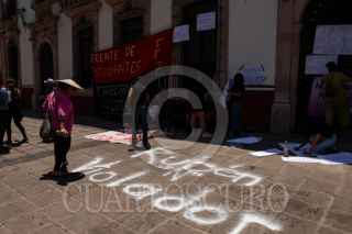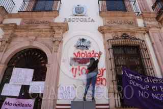 ZACATECAS, ZACATECAS 16MAYO2025.- Mujeres feministas se manifestaron a las puertas de el edificio de Rectoría, para manifestarse en contra de la decisión de un juez, de liberar a Rubén Ibarra Reyes, rector de la Universidad Autónoma de Zacatecas, y llevar su proceso en libertad; luego de ser acusado de violación equiparada, pero después de la audiencia inicial reclasificado por “abuso sexual”, fue puesto en libertad condicional al reconocer el abuso y atenerse al procedimiento abreviado. Las manifestantes además exigieron que Ibarra Reyes renuncia a la rectoría, por su poca calidad moral después de haber reconocido la violencia. FOTO: ADOLFO VLADIMIR /CUARTOSCURO.COM