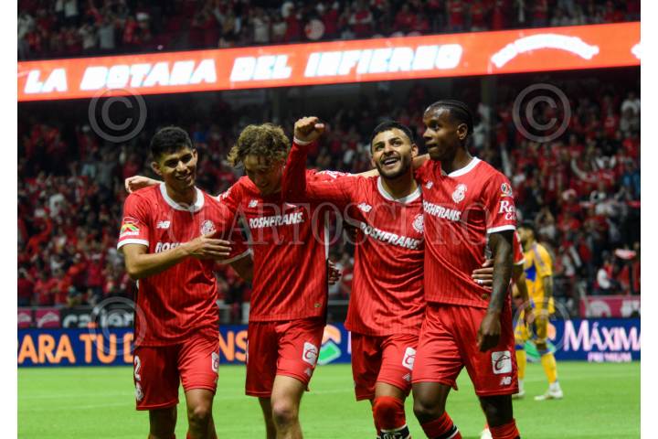 TOLUCA, ESTADO DE MÉXICO, 17MAYO2025.- Diego Barbosa, Marcel Ruiz, Alexis Vega y Helio Nunes jugadores de los Diablos de Toluca festejan su triunfo ante la escuadra de Tigres en el partido de vuelta de semifinales del Torneo Clausura 2025 de la Liga MX, logrando la victoria con un marcador final de 3-0 y un marcador global de 4-1, convirtiéndose en el primer finalista del torneo Clausura 2025. FOTO: CRISANTA ESPINOSA AGUILAR /CUARTOSCURO.COM