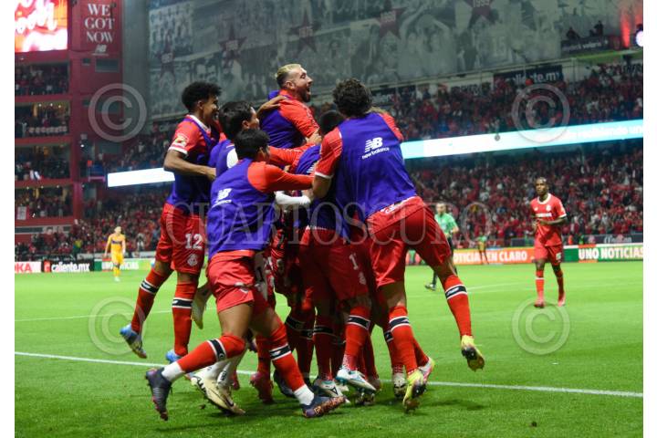 TOLUCA, ESTADO DE MÉXICO, 17MAYO2025.- Jugadores de los Diablos de Toluca festejan su victoria ante la escuadra de Tigres en el partido de vuelta de semifinales del Torneo Clausura 2025 de la Liga MX, logrando la victoria con un marcador final de 3-0 y un marcador global de 4-1, convirtiéndose en el primer finalista del torneo Clausura 2025. FOTO: CRISANTA ESPINOSA AGUILAR /CUARTOSCURO.COM