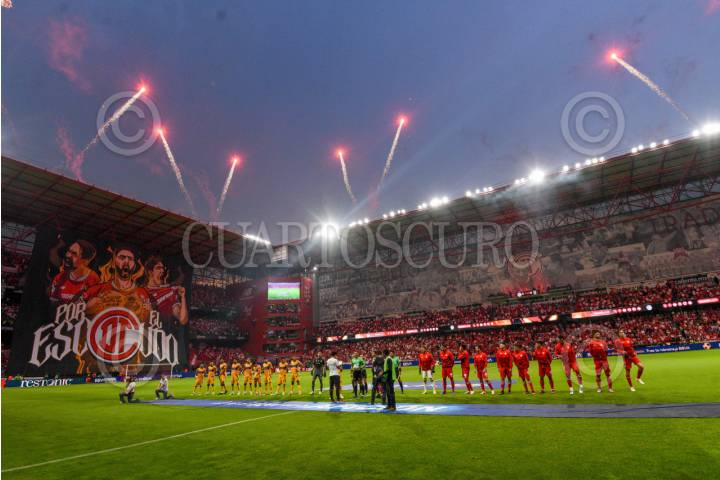 TOLUCA, ESTADO DE MÉXICO, 17MAYO2025.- Los Diablos de Toluca recibieron en el estadio Nemesio Diez a la escuadra de Tigres en el partido de vuelta de semifinales del Torneo Clausura 2025 de la Liga MX, logrando la victoria con un marcador final de 3-0 y un marcador global de 4-1, convirtiéndose en el primer finalista del torneo Clausura 2025. FOTO: CRISANTA ESPINOSA AGUILAR /CUARTOSCURO.COM