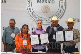 BABORIGAME, GUADALUPE Y CALCO, CHIHUAHUA, 17MAYO2025.- Claudia Sheinbaum, presidenta de México, encabezó la presentación del Plan de Justicia de los pueblos de la Sierra Tarahumara, y firma de Decretos de Reconocimiento de Propiedada Comunal Tradicional. FOTO: PRESIDENCIA/CUARTOSCURO.COM