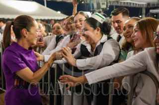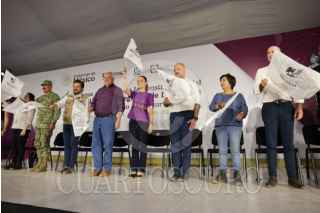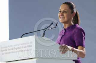 LOS CABOS, BAJA CALIFORNIA SUR, 17MAYO2025.- Víctor Manuel Castro, gobernador de Baja California Sur, y Claudia Sheinbaum Pardo, presidenta de México, durante el evento protocolario del inicio de obras del Hospital General Regional IMSS Los Cabos. FOTO: PRESIDENCIA/CUARTOSCURO.COM