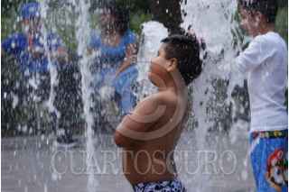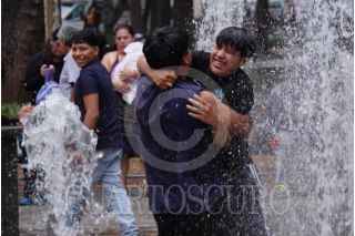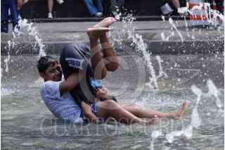 CIUDAD DE MÉXICO, 18MAYO2025.- Jóvenes se refrescaron en las fuentes de la Alameda Central debido a la la Alerta Amarilla que se presenta por las altas temperaturas en la capital. FOTO: GRACIELA LÓPEZ/CUARTOSCURO.COM