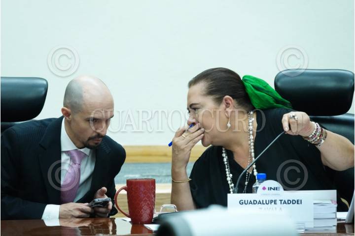 CIUDAD DE MÉXICO, 22MAYO2025.- Arturo Castillo Loza, consejero electoral, y Guadalupe Taddei Zavala, consejera presidenta, conversaron durante la Sesión Extraordinaria en el Instituto Nacional Electoral. FOTO: GRACIELA LÓPEZ/CUARTOSCURO.COM