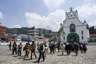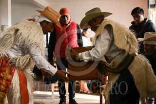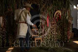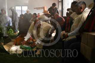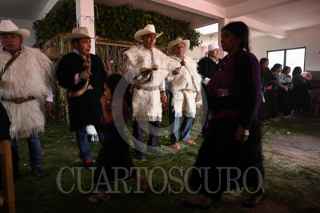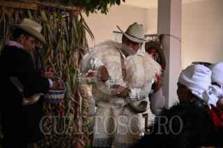 SAN JUAN CHAMULA, CHIAPAS, 22MAYO2025.- En la casa del Paxon del barrio de San Sebastián, las autoridades tradicionales llevan a cabo, en comunidad, el cambio de ornamenta de los altares como parte de los preparativos para una de las fiestas más importantes del pueblo tsotsil de San Juan. Durante esta ceremonia, las y los principales rezan, renuevan los altares, comparten el pox y, al compás de guitarras, arpas y tambores, danzan y entonan oraciones en su lengua materna, el tsotsil. FOTO: ISABEL MATEOS HINOJOSA /CUARTOSCURO.COM